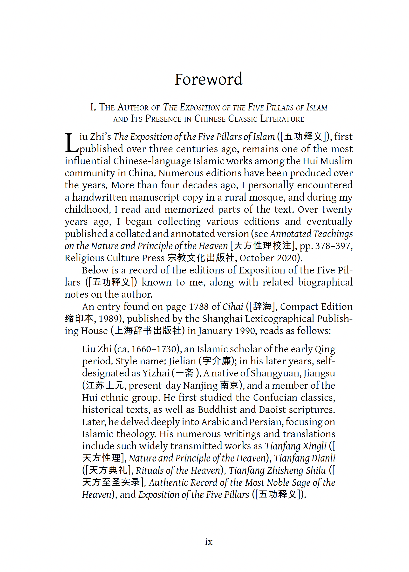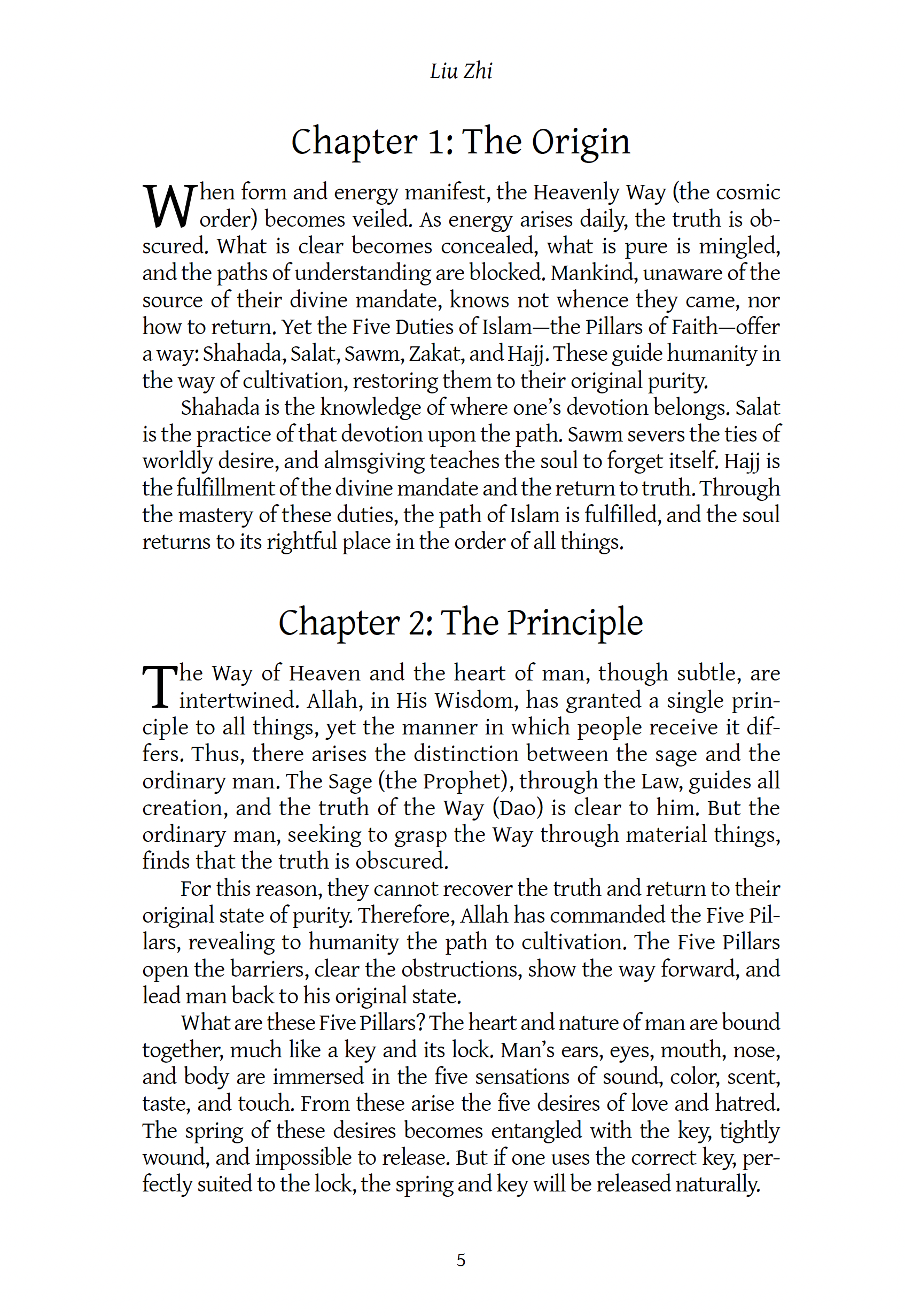 Drawing upon the vernacular lexicon of East Asia, Liu Zhi sought to present the Islamic tradition as “the universal learning” accessible to both Muslims and non-Muslims within the Chinese intellectual and cultural milieu. To achieve this ambition, Liu Zhi redefined the Five Pillars of Islam as a profound wisdom that completes the harmony among the “Three Axes” of Heaven, Earth, and Humanity.